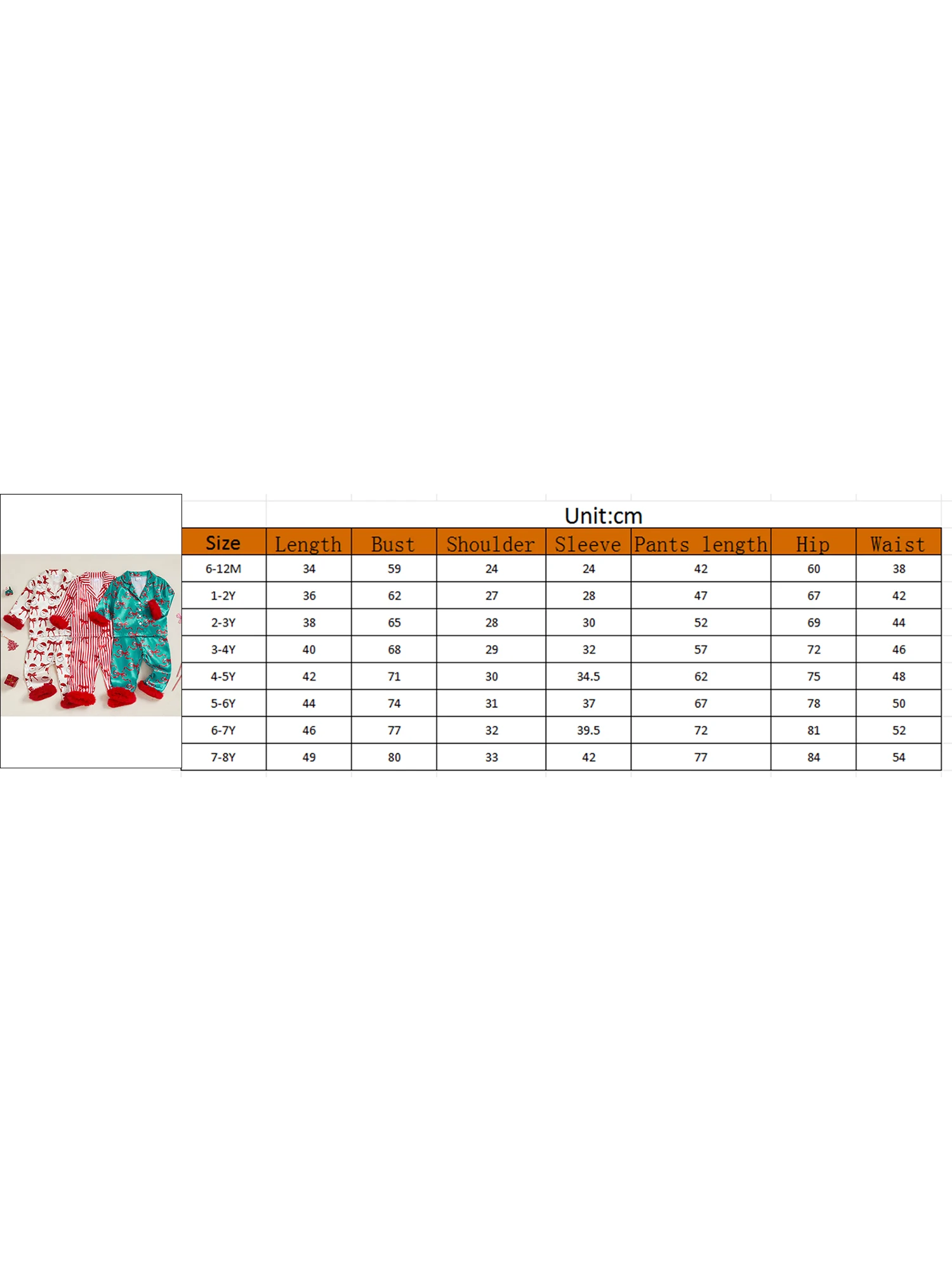 6-12M Tops Length: 34 Bust: 59 Sleeve: 24 Shoulder: 24 Waist: 38 Hip: 60 Pants Length: 42 Suggest Age: 6-12 Months