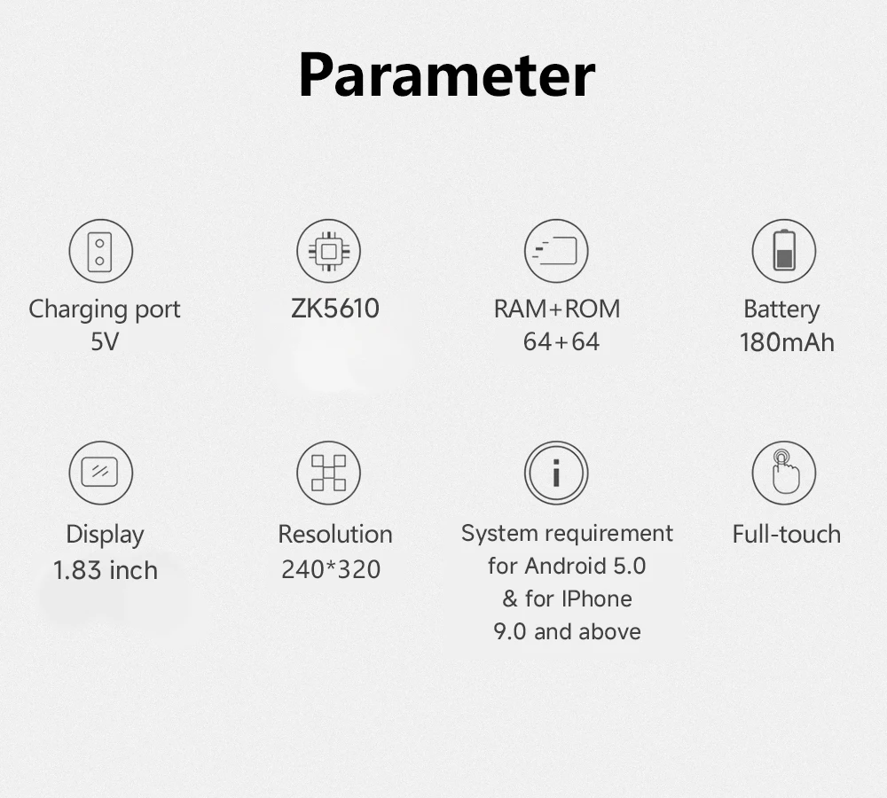 Function: Passometer,sleep tracker,Message Reminder,Call Reminder,Answer Call,Alarm Clock,Calculators