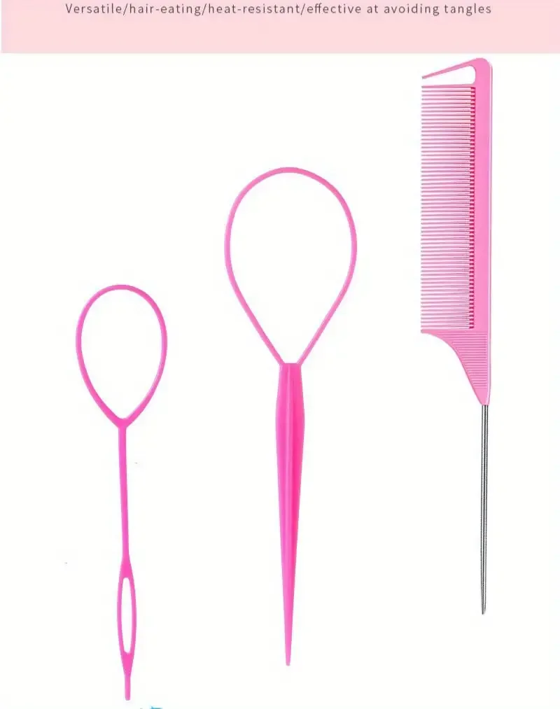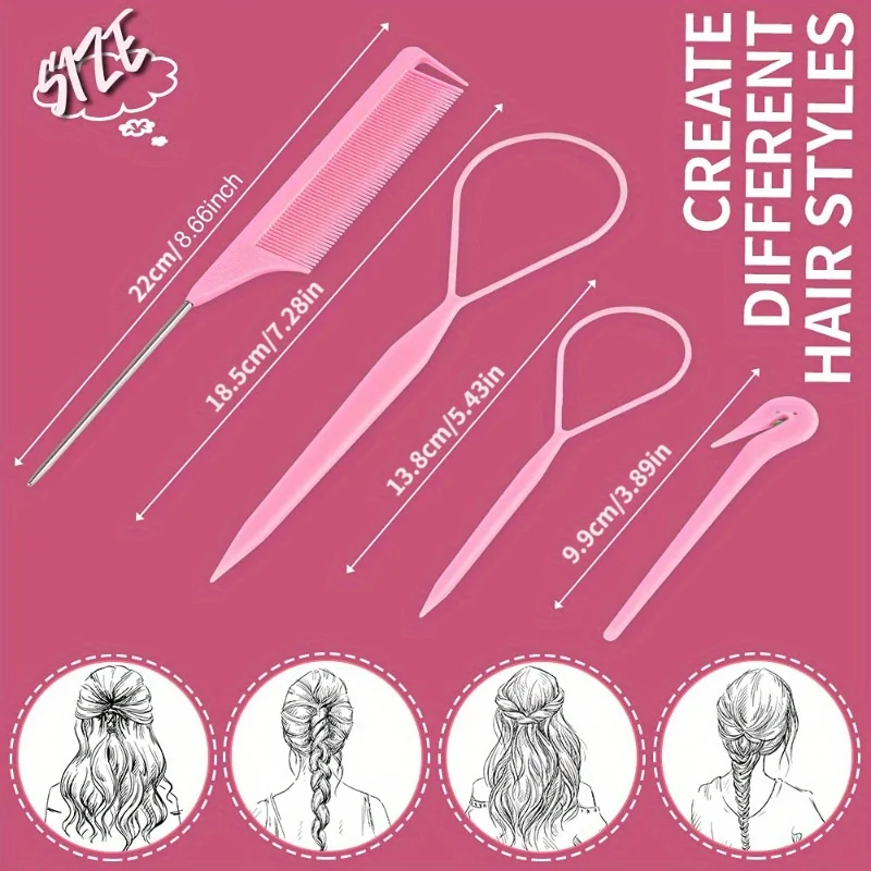 This hair loop tool set includes a French braid tool, rat tail comb, and elastic hair rubber bands remover cutter, offering a comprehensive solution for various styling needs.