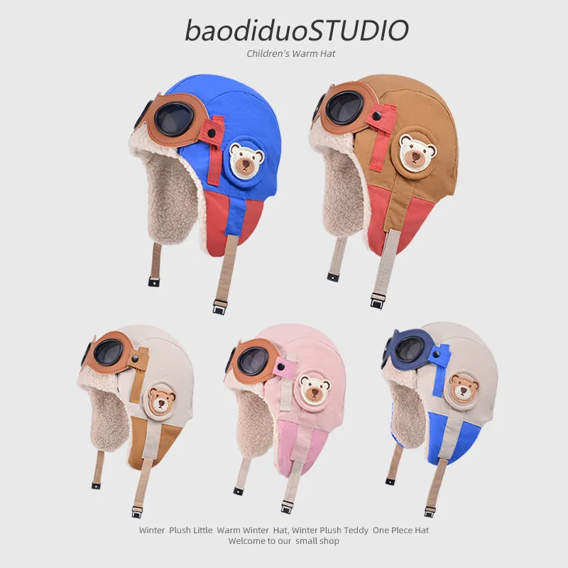 Winter Children Cute Pilot Glasses Lei Feng Hat Boys And Girls Thick Plush Warm Ear Protection Hats